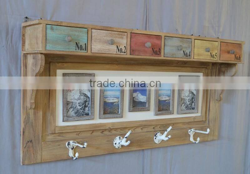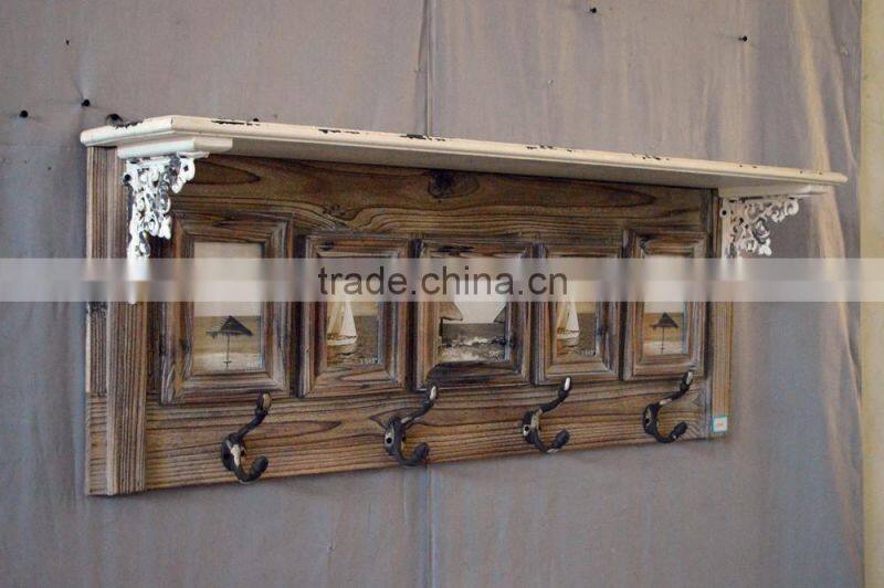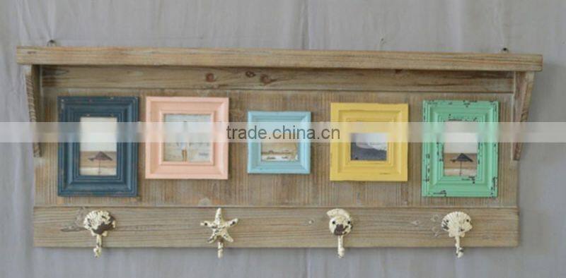 antique wooden wall shelf with colorful photo frame & oceanic metal hangers