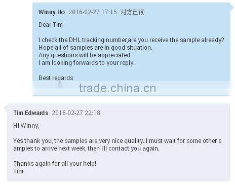 We usual send some samples to our custmers check the quality before place an order.We have already complete 20 transaction on alibaba background.