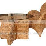 Stool table set of 5pcs for home furniture, wood frame , water hyacinth weaving, T-glass 5mm, cushion 5cm.Des. of goods : Stool table set of 5pcs ( 01 table + 04 stools )