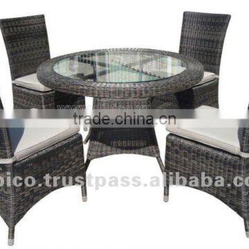 OUTDOOR DINING SET OF 5PCS, AL. FRAME, PE ROUND WICKER 3MM, CUSHION 5CM (FOAM 20Kg/M3, FABRIC 230 Gram/M2), T-GLASS 8MMDes. of good : Outdoor Furniture Rattan Dining Table Set of 5pcs( 04 dining chair + 01 Table)