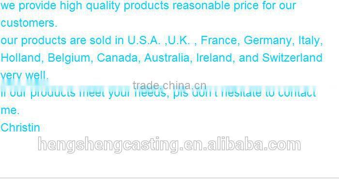 What kinds of products do you produce? | It covers for cast iron fence,lamp post,planters(flower pots),fireplace,fireplace tools,mailbox,telephone booth,fountain(watter basin,hand pump), candle holder,person and animal statue,cast iron furniture(table and bench,chair),cast iron pavilion(green house) cast iron garden ornaments(hose holder,clothes hanger,tree stand,doormat and so on)