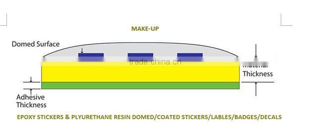 1) Material : upper transparent synthetic resin epoxy or polyurethane epoxy and thickness with 1.5mm ( + approcx180g/sm2 art paper ( CMYK full color printing with off-set printing p[rocess or 1-2 color printing but with slk-screen printing process ) with 0.1mm film glossy lamination + bottom 100g/sm2 Self-Adhesive stcker with 100g/sm2 (3M,T4000,G9000 ETC )