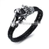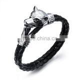 Men Stainless Steel Wolf Bracelet , Braided Black Leather Bracelet