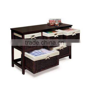 Dark Colored Wooden Furniture & Cabinet With 5 Wicker Basket Drawers With White Lining