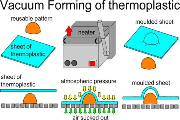 Vacuum forming is a simplified version of thermoforming, whereby a sheet of plastic is heated to a forming temperature, stretched onto or into a single-surface mold, and held against the mold by applying a vacuum between the mold surface and the sheet.