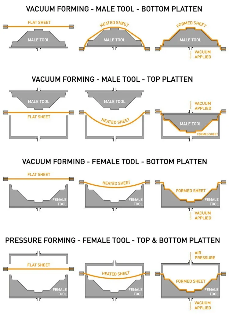 Vacuum forming is a simplified version of thermoforming, whereby a sheet of plastic is heated to a forming temperature, stretched onto or into a single-surface mold, and held against the mold by applying a vacuum between the mold surface and the sheet.