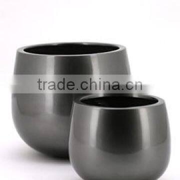 These glossy grey fiberstone pots are made from a moulded polymer compound with fiberglass reinforcing the forms. Several layers of grey paint give the pots a beautiful lacquerware look.
