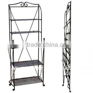 with the flip of your wrist this sturdy, wrought iron baker's rack folds completely flat for easy portability and space saving storage.