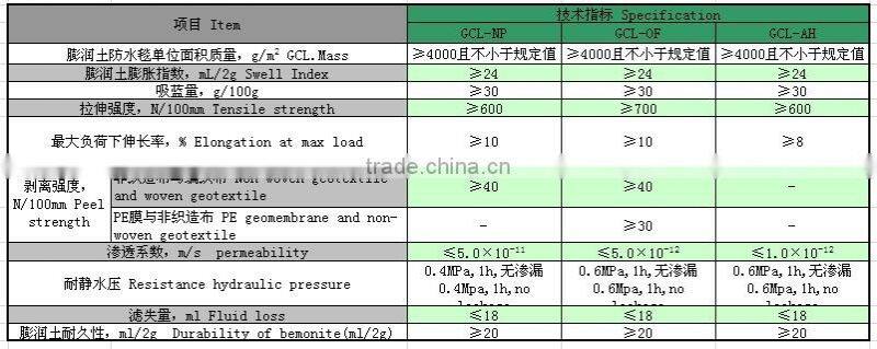 Geosynthetic Clay Liner is a kind of special used for artificial lake water, landfill, underground garage, the roof garden, pool, oil and chemical storage area such as seepage prevention of geosynthetic materials, it is made of high dilatability of sodium base bentonite filling between the special composite geotextile and non-woven fabric, with acupuncture law into bentonite seepage control pad can form many small fiber space, is bentonite particles can not be like a direction, when under the influence of water within the mat forming uniform density of colloidal membrane, prevent the leakage of water.
