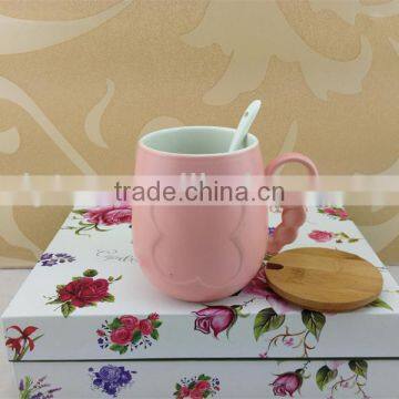 Promotional Ceramic Coffee Mug Solid Color Embossed Butterfly Design With Wood Lid and Spoon