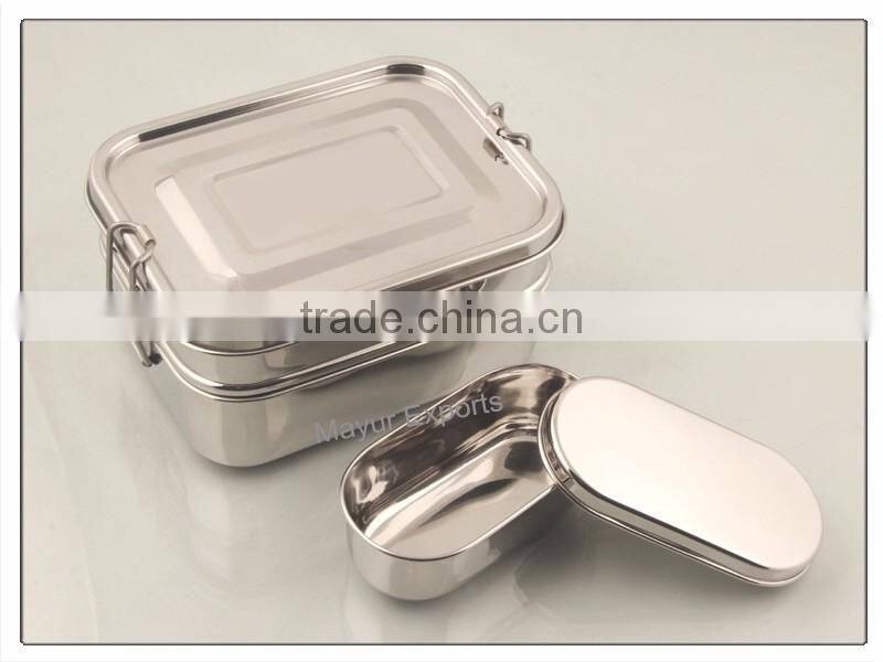 We are OEM manufacturers and exporters of High Quality Stainless Steel Lunch Boxes and Tiffins that are widely used for single as well as multiple purposes for storage food. The Stainless Steel 3-in-1 Sustain-a-Stacker lunch box + mini container is a safe and earth-friendly alternative to plastic sandwich bags. The bottom layer can hold a sliced sandwich, the middle layer holds fruit, pasta or salad, and the small inner container can hold a half-cup of snacks/sauce,etc. Perfect size of Sustain-a-Stacker Lunch box it still allows you to pack a good sized lunch. You can Pack a Lunch to say goodbye to plastic baggies and other leachy plastic food containers.