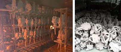 Dry sand shell will place in the fire kiln where the shell is cured and the wax pattern is melted out, after several hours, the shell is ready to contain the molten bronze, this is “ lost wax” .