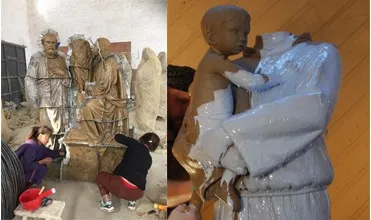 Painting the latex rubber onto the original clay mold, that’s been added in layers. When dry, the rubber mold has been completed . (the large sculptures will create plaster mold) .