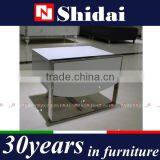 a. E1 MDF with white lacquer finished for the table frame, tempered glass table top.