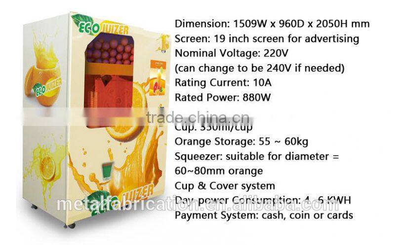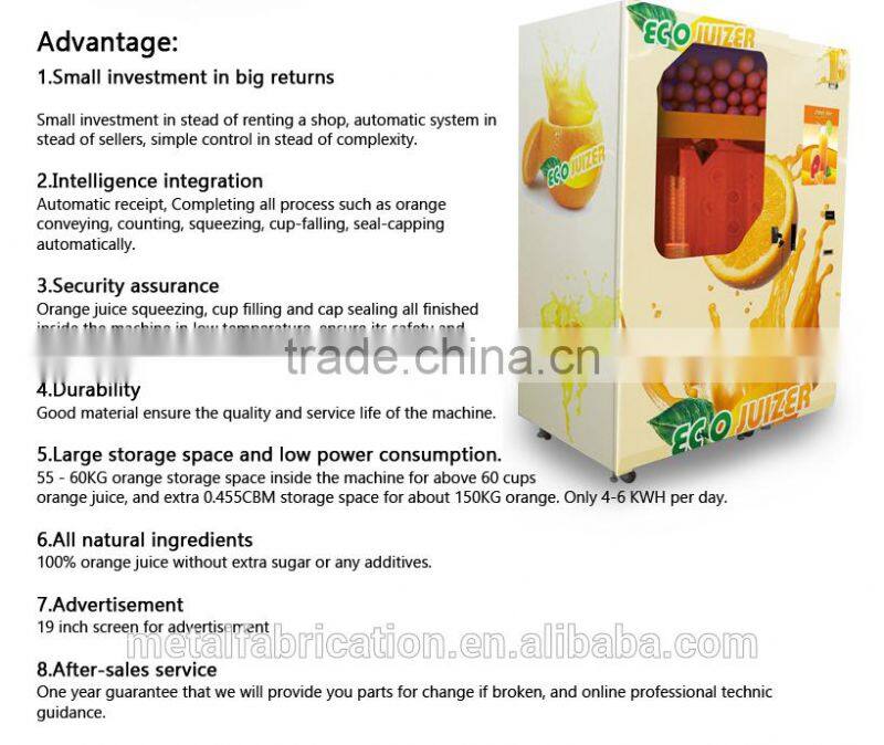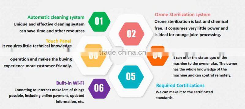Machinery, refrigeration, automatic control, networking, self-service cash acceptance technology, and at a low temperature closed in a sterile environment, with fresh clean orange, automatic, fast, hygienic squeeze your site without adding any original juice, orange juice delicious flavor. 1 cup orange 5 to 8, 100% original squeezed juice, sterile press, 40S complete, automatic drop cup sealing, automatic ozone sterilization.