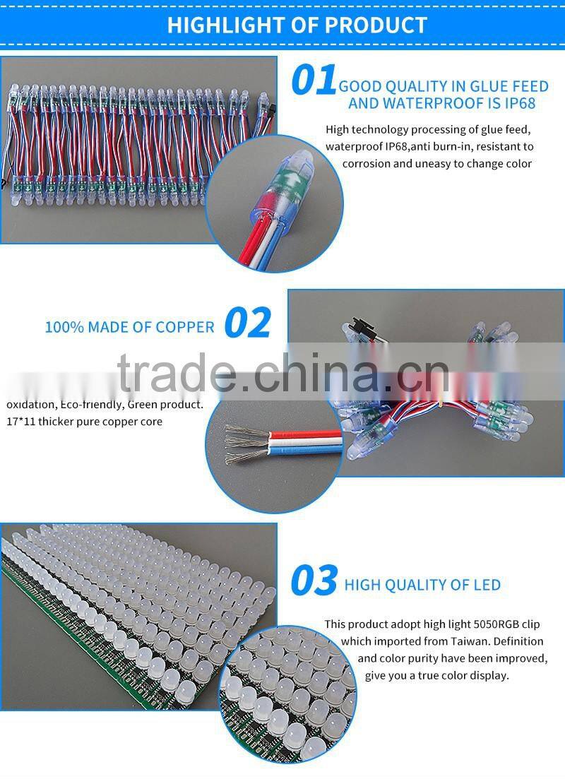 4. LED string adopt smart control system could gradually change, jumping, chasing, scanning, and display cartoon images or characters, it also could control in asynchronous and synchronous, and array randomly to meet the needs of different users.