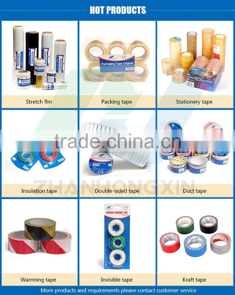 Our company production including bopp packaging tape, bopp stationery tape, LLDPE stretch film. Hand use stretch film. Machine use stretch film. Colorful stretch film. Special stretch film. Pre-stretch film tape, super thin stretch film. Masking tape, double sided tape. Double sidefoam tape, warning tape, PVC insulation tape, Aluminium foil tape. Kraft tape, reinforced Gummedkraft paper tape. Gummed kraft paper tape. Invisible tape,PVClane marking tape. Picture as below: