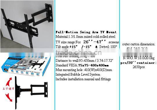 Full-Motion Swing Arm TV Mount TV size range:For 26''-47'' screens