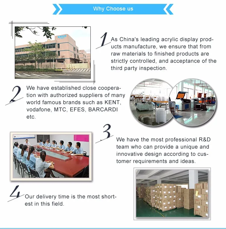 The material usually use import acrylic, also can make in PET G,PC,PS,PVC etc.