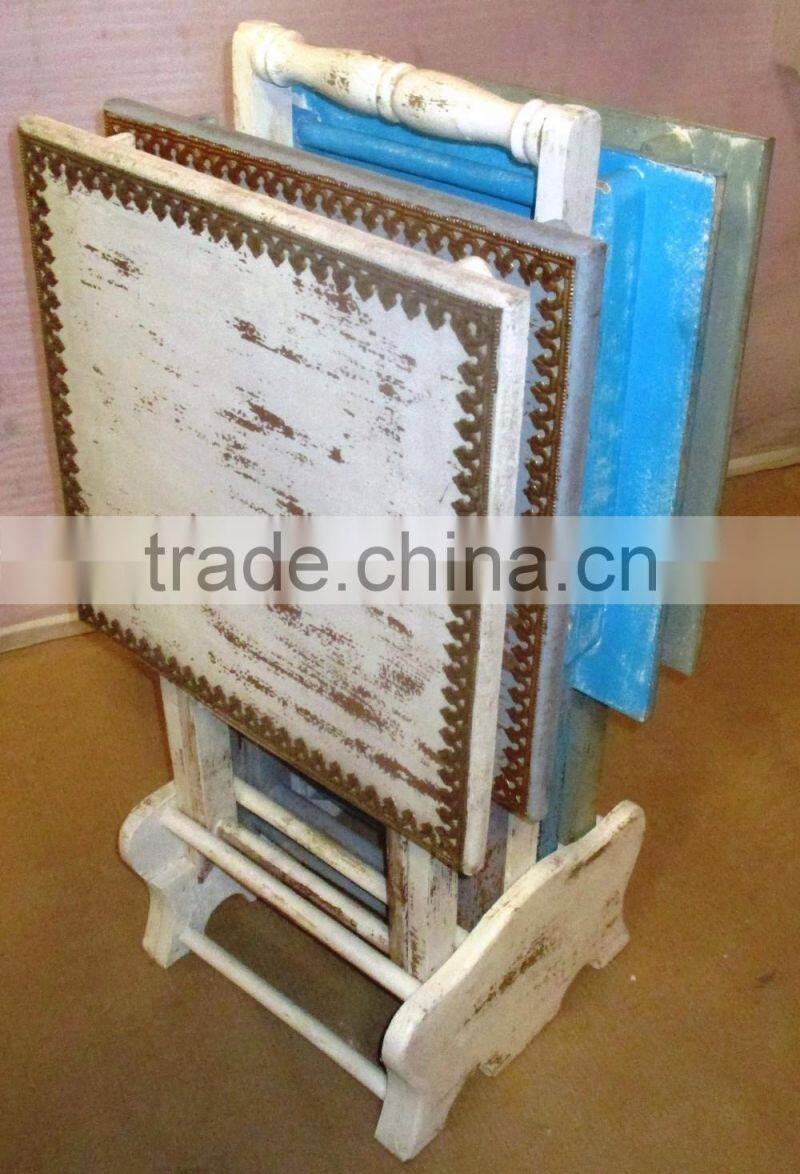 Home > Products > Indian Furniture Zone > Metal Fitted Natural White Blue Set of 4 Wooden Square Stool