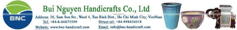 Thank you for your attention on our online showroom. BUI NGUYEN HANDICRAFTS CO., LTD (BNC) is known as a company that manufacture and export Vietnamese pot and planter in the South of Vietnam. Our products are made from environment-friendly materials such as clay, rattan, bamboo, water hyacinth, wood, recycled rubber. Our collections include high quality pots with various shapes and size. BNC products are suitable for indoor and outdoor, gardener and decoration, contemporary and traditional. Inheriting long-standing pottery making method of Vietnam, BNC provides the best quality of product with the most reasonable price.