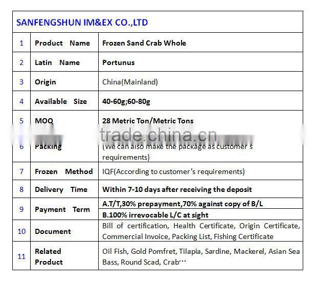 Home > Agriculture & Food > Aquatic & Preparation > Frozen Sand Crab Whole