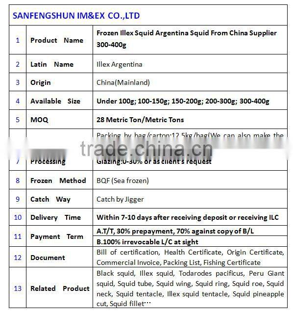 Frozen Illex Squid Argentina Squid From China Supplier 300-400g