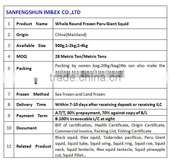 a. Illex squid, Todarodes pacificus, Black squid, Peru giant squid, Peru squid neck, Peru squid tentacles, Illex squid tentecle, Peru squid piecesn& bits, Squid body, Squid head, Squid roe, Illex squid roe, Squid fillet, Squid pineapple cut, Squid ring, Squid ring skinon, Squid wing, Squid tube......