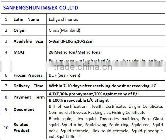 a. Illex squid, Todarodes pacificus, Black squid, Peru gaint squid, Peru squid neck, Peru squid tentacles, Illex squid tentecle, Peru squid piecesn& bits, Squid body, Squid head, Squid roe, Illex squid roe, Squid fillet, Squid pineapple cut, Squid ring, Squid ring skinon, Squid wing, Squid tube......
