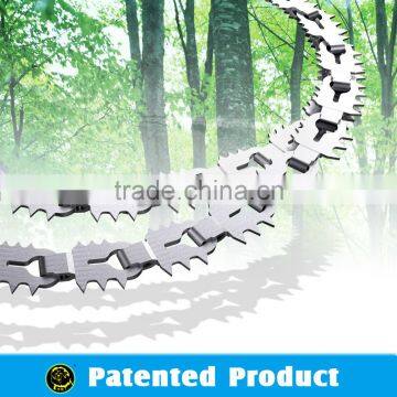 Chain saw is made of 440 stainless steel, with special quenching treatment, which makes it sharper and more durable than usual one or traditional one, with the feature of portability, extralightness,multifunction (e.g.sawing wood,tree, bamboo, waterpipe etc.). The lightspot is that it surpasses the traditional one and achieves the portabilty of two-sided designed chain saw and it can adapt to different kinds of environment.