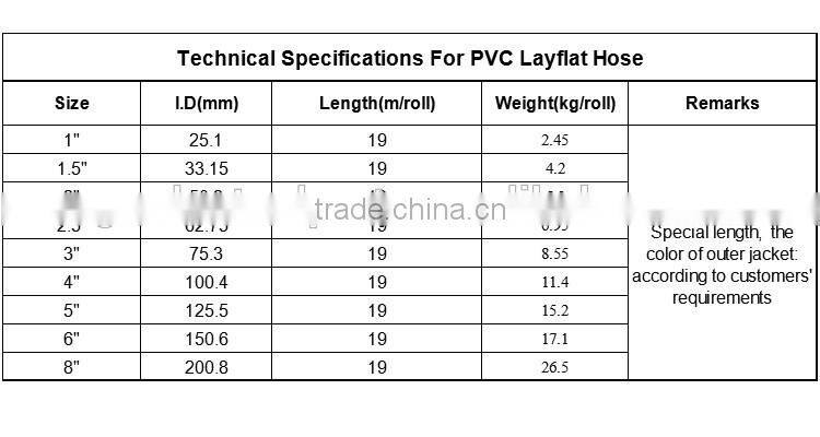 A: We can produce lay flat hose according to your request on Inner Diameter, working pressure,color and length per roll. Before send you right quotation, please kindly confirm with us.