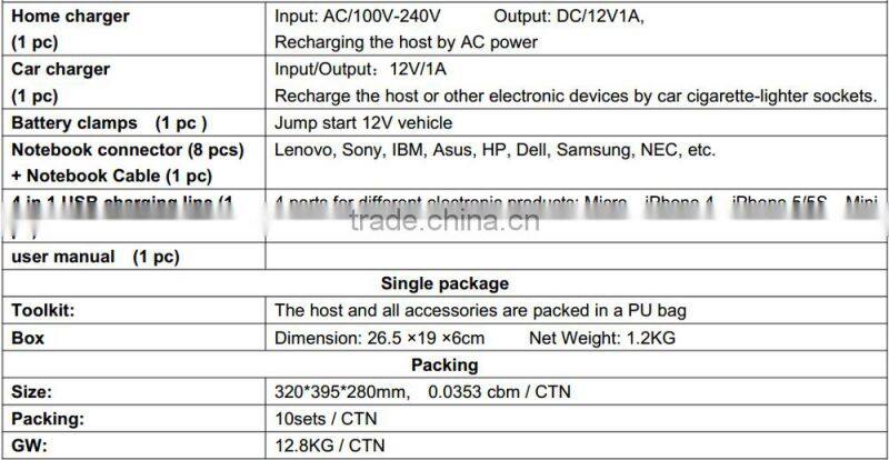 Specification of car power Multi-Function Jump Starter For < 6000cc 12V/24V vehicles(gasoline&diesel) 12000mAh / 10000mAh / 8000mAh :