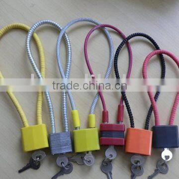 -This lock consists of an armored steel cable with one end permanently secured to