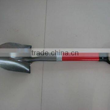 small shovel with red fiberglass tube handle with plastic Y grip. Head material is railway steel. It's one shovel popular for women and children used for camping or gardening use.