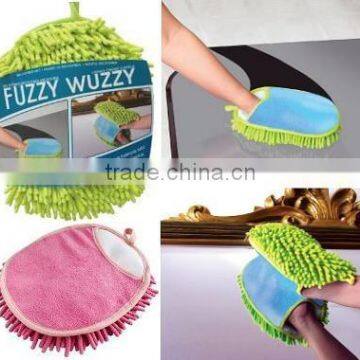 There is no need for detergents. Fuzzy Wuzzy is washing machine safe. It can be used over and over again with the same stunning results. The Fuzzy Wuzzy mitt can be used on virtually any surface. In the kitchen, in the bathroom, to clean windows, mirrors and more. Household cleaning is quick and easy with this unique double-sided, multi-purpose mitt. One side's chenille for easy jobs, one side's microfiber for tougher jobs. Use on mirrors, countertops, tabletops, autos, furniture and more.