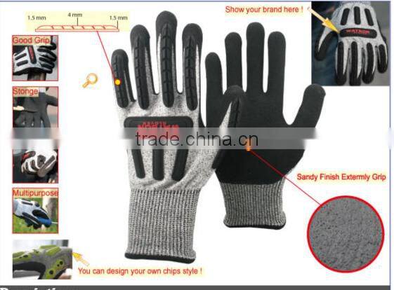 13 gague black nylon, HPPE and glassfiber coated balck sandy nitrile on palm ,and black TPR on glove back