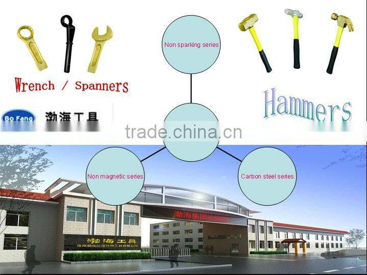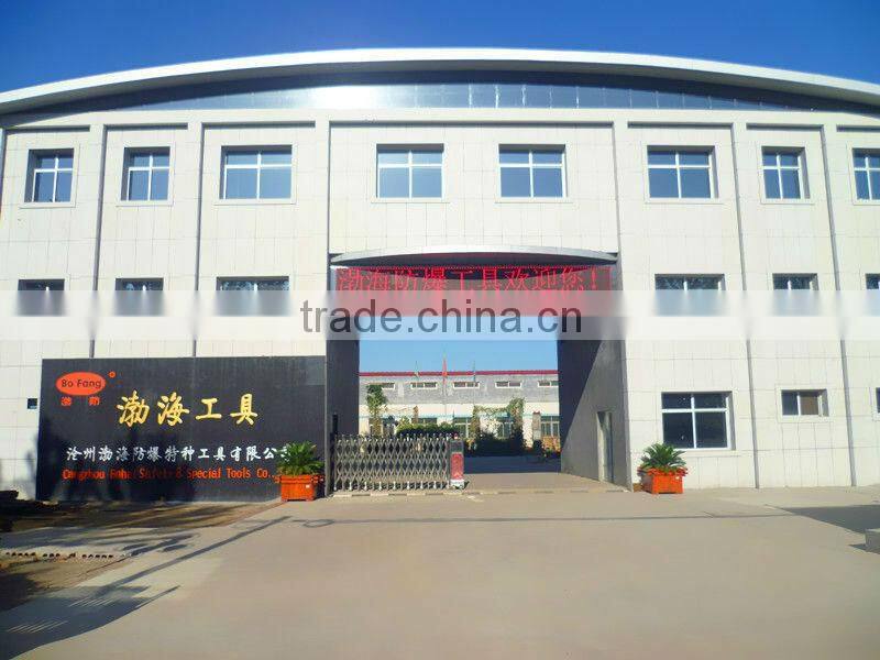 Cangzhou Bohai Safety & Special Tools Group Co., Ltd. is a professional manufacturer.Our main products are non sparking safety tools,Steel DIN stand hand tools, Stainless steel hand tools, including slogging spanners, sockets, pliers, brass hammers, cooper hammers, F-Valve spanner and more than 300 kinds of products,We can also develop new products according to your needs.Established in 1978. We expanded to a group in 2006 based on original Cangzhou Bohai Explosion-proof and Special Tools Manufacturer. series. In 2001, all our products got ISO9001 and UKAS certification. All of our products are manufactured in strict with GB10686-89 and DIN Standard. The non sparking tools are mainly used in the hazardous environment where flammable and combustible vapors liquids gas dusts are present. They are applied in the petroleum industry, chemical industry, power generation, railroad and mining. Our company insists on the principle that "Customer is God" and would like to cooperate with all of the customer with high-quality products and excellent after-sale service.