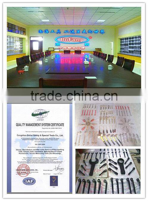 Cangzhou Bohai Safety & Special Tools Group Co., Ltd. is a professional manufacturer.Our main products are non sparking safety tools,Steel DIN stand hand tools, Stainless steel hand tools, including slogging spanners, sockets, pliers, brass hammers, cooper hammers, F-Valve spanner and more than 300 kinds of products,We can also develop new products according to your needs.Established in 1978. We expanded to a group in 2006 based on original Cangzhou Bohai Explosion-proof and Special Tools Manufacturer. series. In 2001, all our products got ISO9001 and UKAS certification. All of our products are manufactured in strict with GB10686-89 and DIN Standard. The non sparking tools are mainly used in the hazardous environment where flammable and combustible vapors liquids gas dusts are present. They are applied in the petroleum industry, chemical industry, power generation, railroad and mining. Our company insists on the principle that "Customer is God" and would like to cooperate with all of the customer with high-quality products and excellent after-sale service.