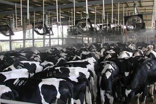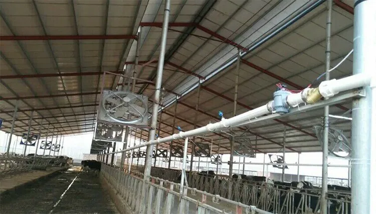 Spraying Cooling System is the most practical and effective cooling way for poultry house. It sprays the small water-drop (not water mist) to cow or pig’s back to wet its skin. Then, the water absorbs heat on the cow or pig while evaporating into vapor to achieve cooling function. This Spraying system is mainly used for cooling down cow or pig itself temperature, not the cow house or pig house temperature.