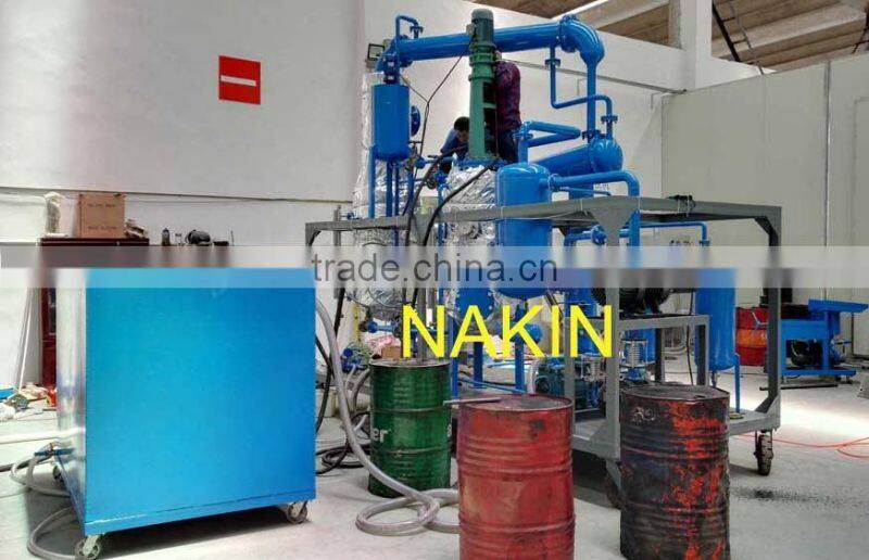 So our company researches the new waste oil vacuum distilling machine (JZC waste oil distillation machine), it is special for distilling and regenerating the black waste lube oil, including waste engine oil, lube oil, hydraulic oil, gear oil, dirty diesel oil, mixed oils etc. This equipment adopts physicochemical way to polymerize,passivity, absorb, eliminate impurities and harmful contaminations. JZC waste oil distillation machine heat the waste oil to (from 110℃ to 350℃) different temperature under high vacuum condition, making Hydrocarbon molecules break out, and re-order combination, forming diesel oil, lubricating base oil etc. JZC machine is very suitable for the small oil refinery company, also for the small oil company who want to make the oil by self.