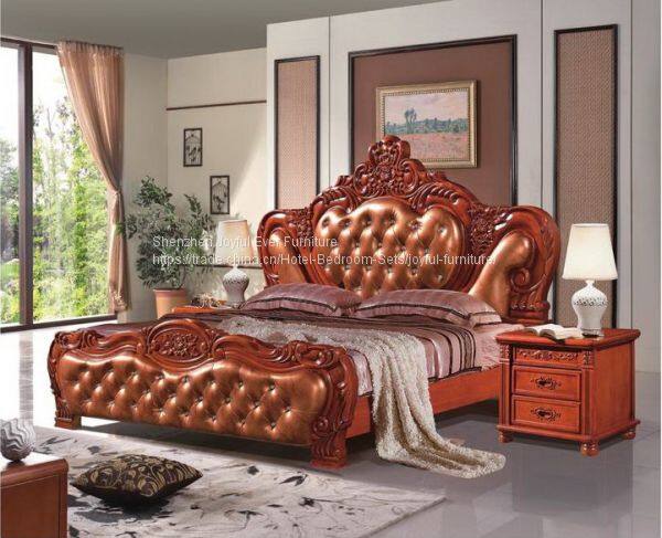 Luxury craft France rubber solid wood Double bed in Leisure design Real Leather Heaboard Bed Hign hotel bedroom furnitur