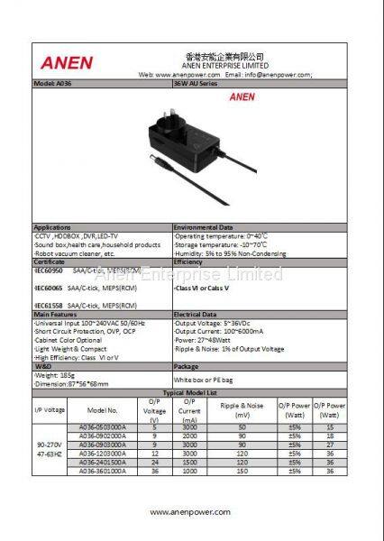 36W AC Adapter with AU Plug,GS,CE, UL approval, VI Efficiency, 24V1A 12V2A 12V1.5A 24V0.8A Power Adapter