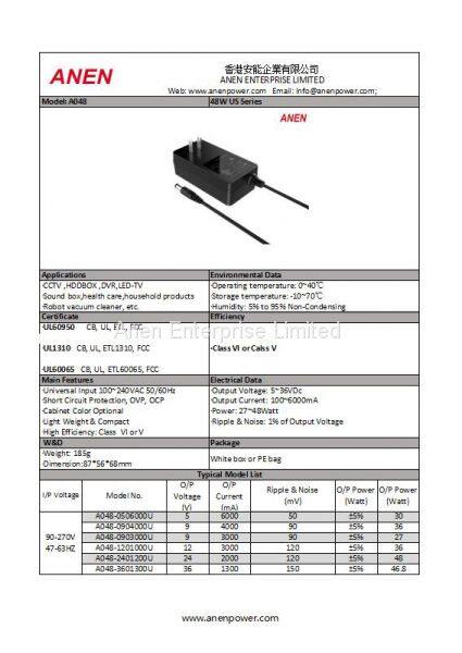 48W AC Adapter With US Plug,GS,CE, UL Approval, VI Efficiency, 24V1A 12V2A 12V1.5A 24V0.8A Power Adapter