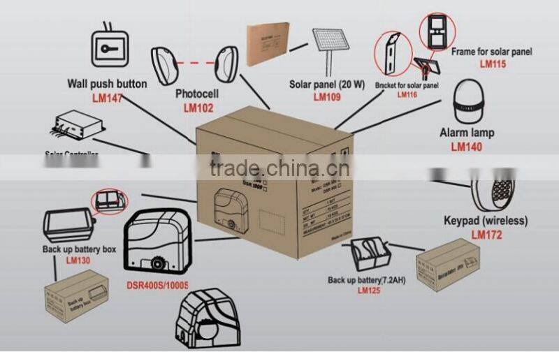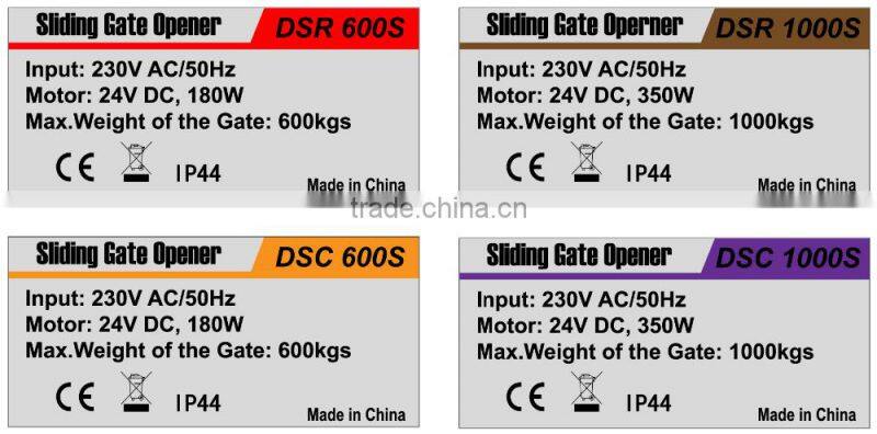 24V DC motor gate motor used for rack driven sliding gates. Industrial gates, garden gates, factory gates, warehouse gates etc. We have DSR400, DSR600S, DSR1000S models.They are remote controlled for open or close your gate automatically. Can be Eco-friendly solar compatible.Solar always used as the back up power in case the main AC power is out. Our 10W/20W/30W lead-acid Battery solar kit available for your optional choice.