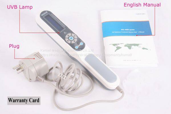 3.UV Phototherapy lamp IntroductionKN-4003A Handheld uv therapy for home use is developed by kernel medical, adopt Philips company PUVA lamp(PL-S 9W/01/2P). Through the microcomputer control system, and set the treatment time,simple operation,It is the one of the most popular product for treatment of Psoriasis,vitiligo pityriasis rosea and eczema etc.+
