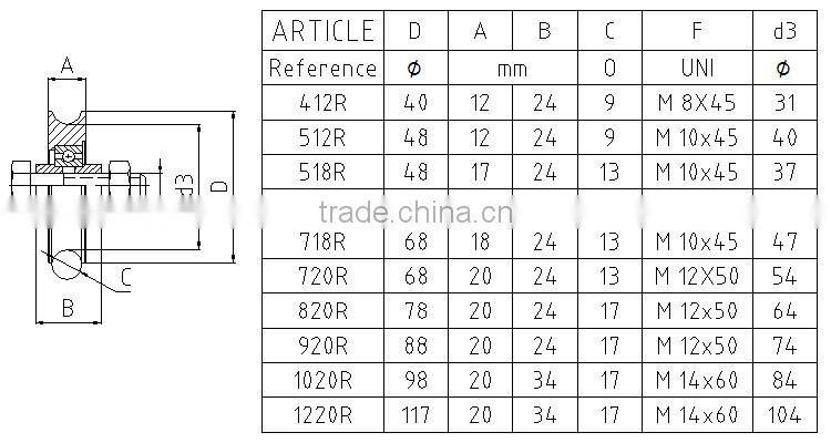 Wheel article of photos is 618R producing by CNC lathe,with 8.8 degree bolt and nuts,one pcs 6201RS bearing.Wheel materal C45 steel.Color yellow or white zinc.