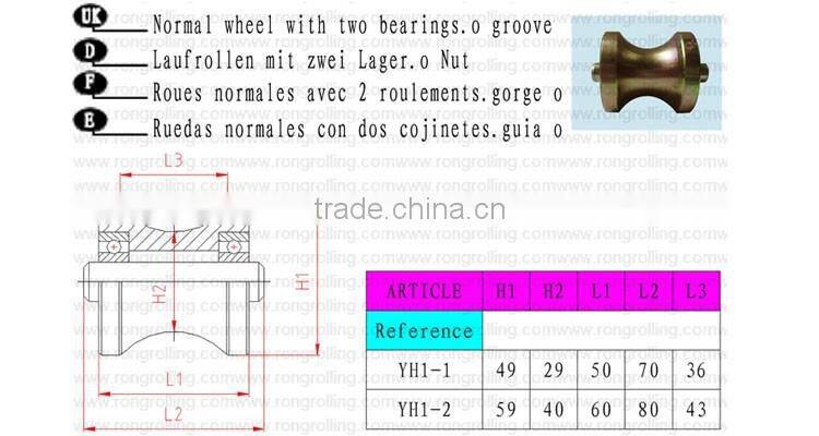 Wheel article of photos is YH1-1 producing by CNC lathe,two pcs 6201RS bearing.Wheel materal C45 steel.Color yellow or white zinc.Diamter:49mm,Thickness:50mm,Applicable diameter of 30 mm (inclusive) track or rope.The wheel size and other similar products ,please see attached drawing.