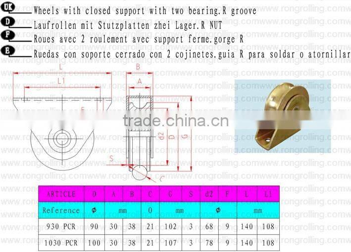Wheel article of photos is 1028PCR producing by CNC lathe,with outer support,two pcs 6203RS bearings.Wheel materal C45 steel.Color yellow or white zinc.Diameter 98mm,thickness 28mm,U groove diameter 21mm.Applicable diameter of 20 mm (inclusive) track or rope.My company have steel materal track for the wheel.Re:the wheel support size,please see attached similar wheel drawing.