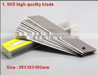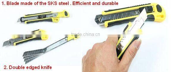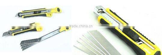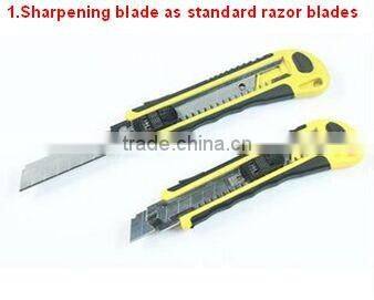 a snap-off utility knife that contains a long, segmented blade that slides out from it. As the endmost edge becomes dull, it can be broken off the remaining blade, exposing the next section, which is sharp and ready for use. The snapping is best accomplished with a blade snapper that is often built-in, or a pair of pliers, and the break occurs at the score lines, where the metal is thinnest. When all of the individual segments are used, the knife may be thrown away, or, more often, refilled with a replacement blade.