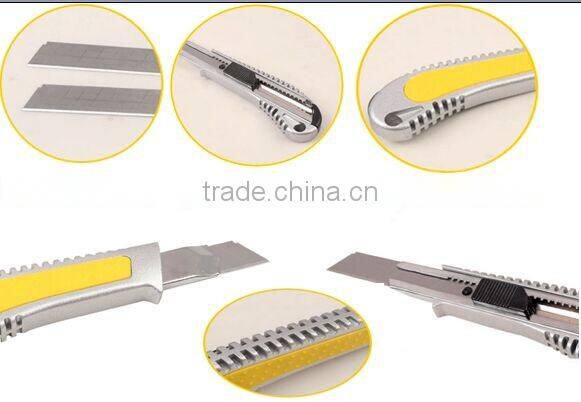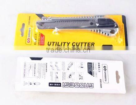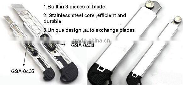 a snap-off utility knife that contains a long, segmented blade that slides out from it. As the endmost edge becomes dull, it can be broken off the remaining blade, exposing the next section, which is sharp and ready for use. The snapping is best accomplished with a blade snapper that is often built-in, or a pair of pliers, and the break occurs at the score lines, where the metal is thinnest. When all of the individual segments are used, the knife may be thrown away, or, more often, refilled with a replacement blade.